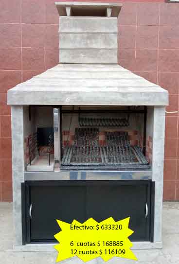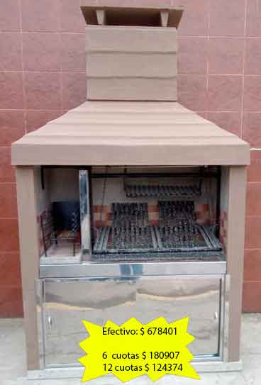 Sistema de regulacion de altura de parrilla derecha/izquierda, manija zincada. Doble placa refractaria en la parte del fogon. Luz y juegos de herramientas.